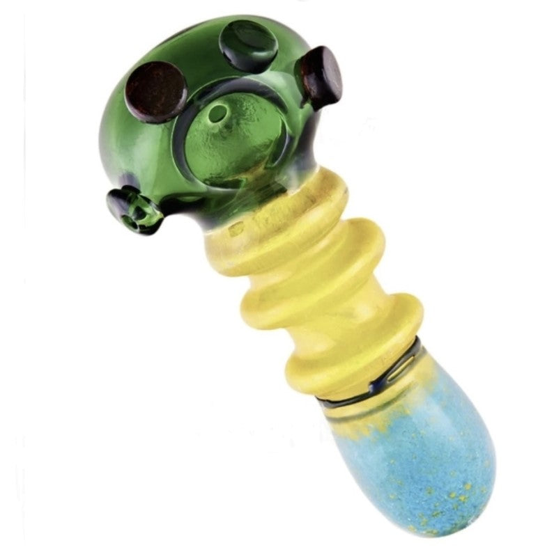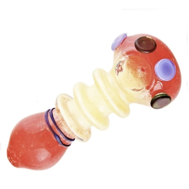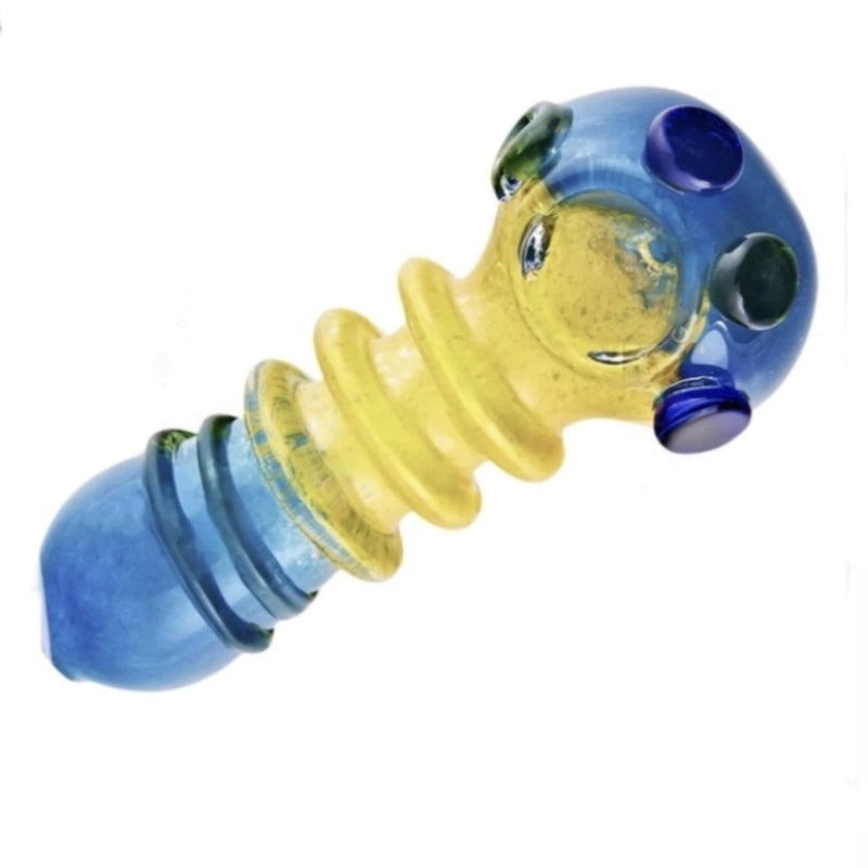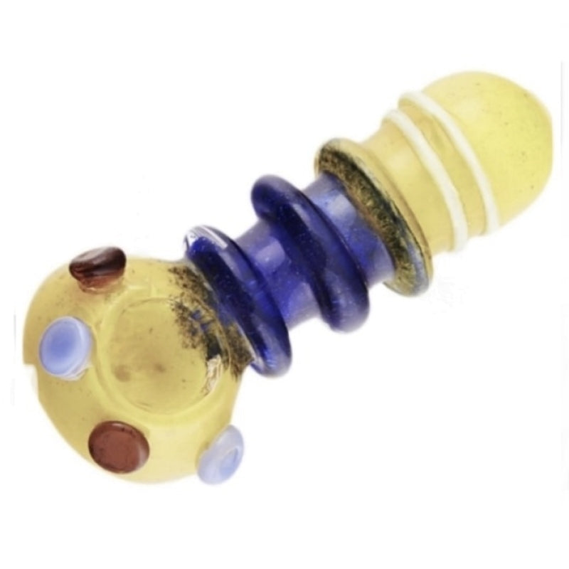 5" Heavy 150gm Thick Glass Hand Pipe with 3 Rings and 4 Buttons on Bowl Assorted Colors. The distinctive 5” Thick Glass Hand Pipe sets itself apart with intricate color accents and an ergonomically shaped handle with 3 rings.. Its design is easy to securely handle. Measuring at 5 ”, this glass pipe is easily portable. High quality, heat resistant glass is fashioned into the oblong shape, adding to its ruggedness.